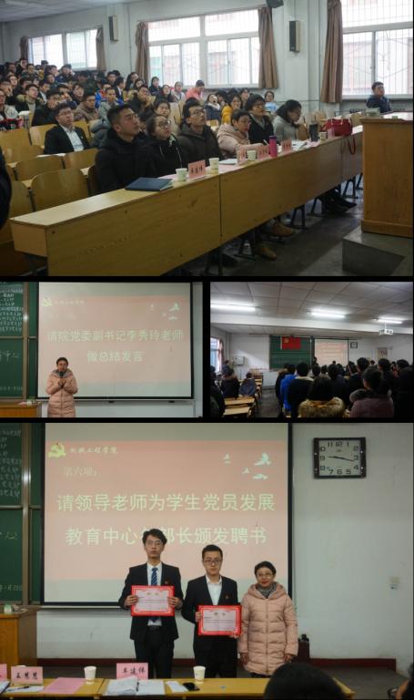 党员发展教育中心换届会议在庄严的国际歌声中拉开了序幕。活动初始,第一届党员发展教育中心常务副主任高鑫宇、袁飞同志汇报总结了其在职期间学生党建的各项工作。其次,院党委副书记李秀玲老师宣读了《关于第二届学生党员发展教育中心各部部长聘任的决定》。第二届学生党员发展教育中心常务副主任靳凯毅、李国栋同志对其在职期间的计划做了汇报。领导老师为新一任部长颁发了聘书,鼓励他们在新的岗位不断努力。