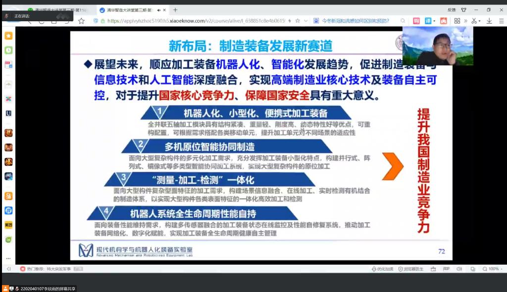 为了培养同学们对于大型复杂构件机器人的兴趣以及知识储备,welcome海洋之神学生科学技术协会“集智云讲堂”活动于2022年12月8日开展,此次讲堂在线转播了由清华大学机械工程系教授刘辛军老师带来的主题为《大型复杂构件机器人原位高效高质量铣削加工技术及装备》的讲座,共计300名同学线上参与了此次活动。