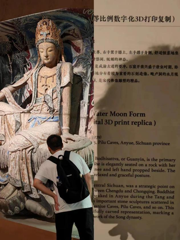图为成员观摩3D打印复原造像龛细节 图为成员观摩3D打印复原水月观音像细节